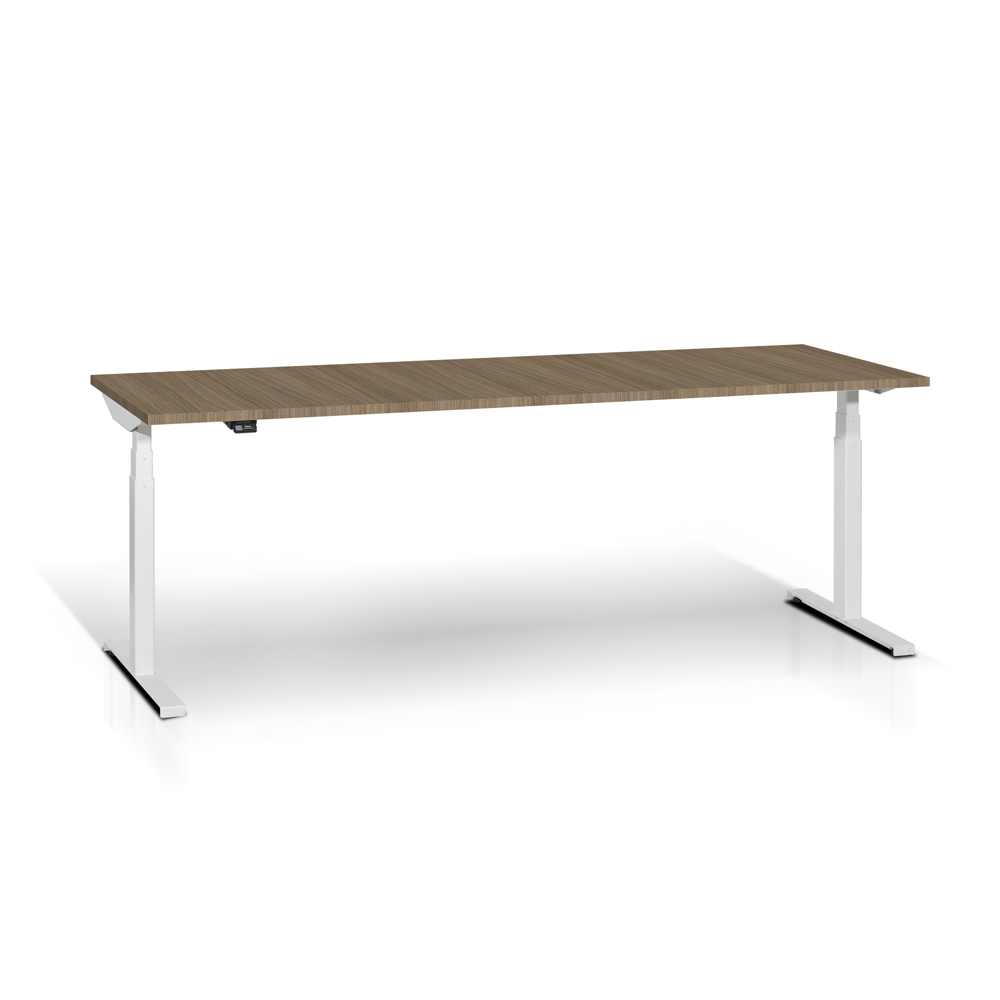 Scrivania con gambe a "T" elevabili elettricamente. Piano in melaminico noce sp. mm. 25, gambe in acciaio verniciato bianco RAL 9016 con cavo motore da mm. 1550, alimentatore a 230V, cavo connessione da mm. 1800. Dotata di kit anti collisione a sensore. Portata kg. 80. Dim.: mm. 2000x800x585/1235h.