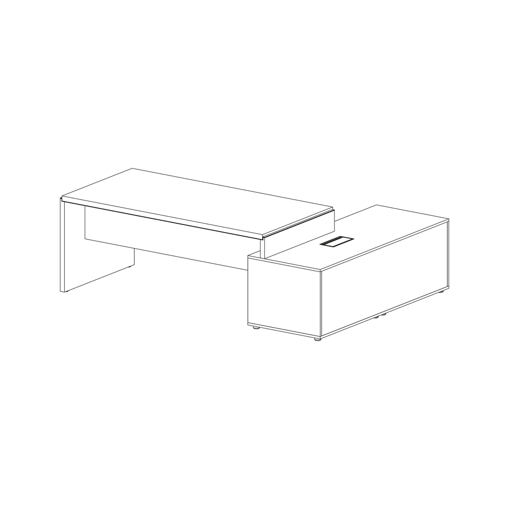 Scrivania mm. 1800x900. in appoggio su mobile di servizio sinistro dotato di ante scorrevoli e top acces passacavi, in melaminico rovere. Profili laterali in alluminio lucidato. Dim.: mm. 2300x1650x740h.