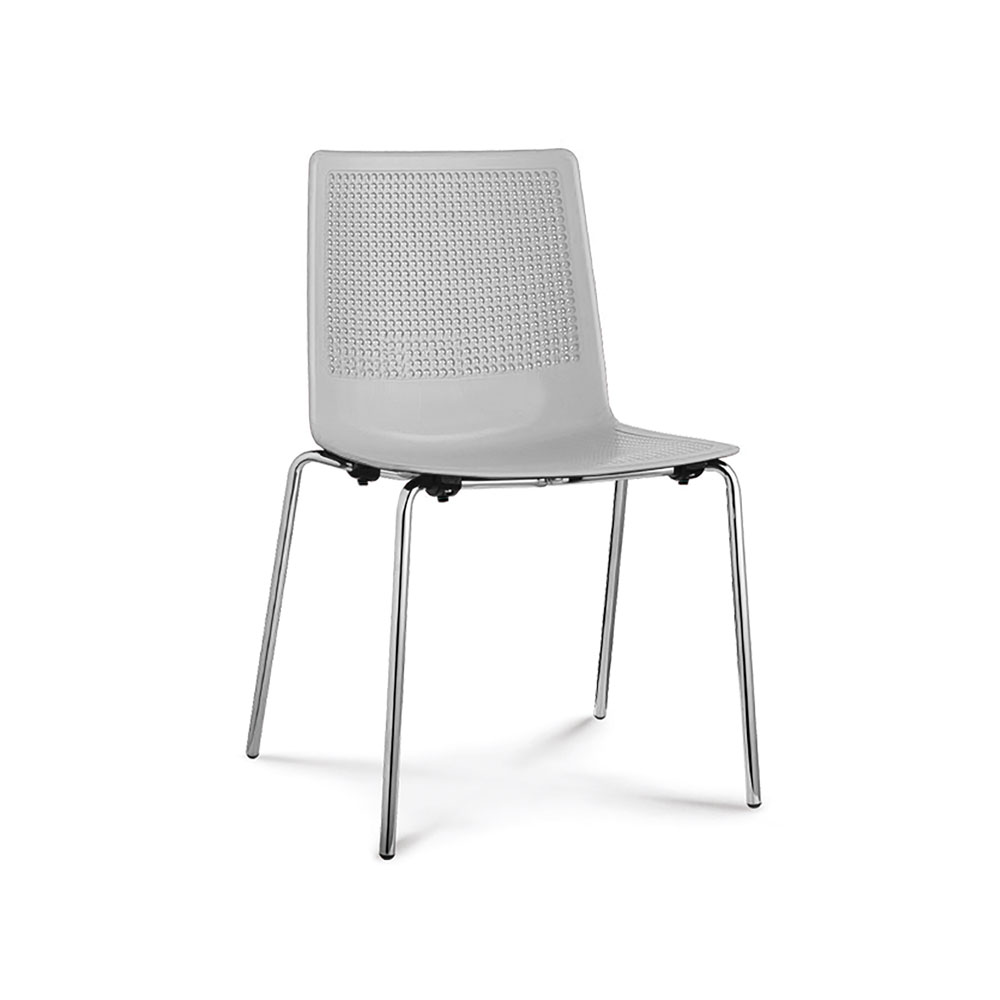 Sedia fissa ASTRA con struttura a 4 gambe cromate, monoscocca in polipropilene bianca. Impilabile