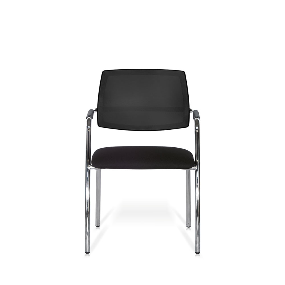Sedia fissa DEMETRA con struttura in acciaio cromato, schienale in polipropilene rivestito in rete ignifuga nera. Sedile imbottito e rivestito in tessuto ignifugo nero.