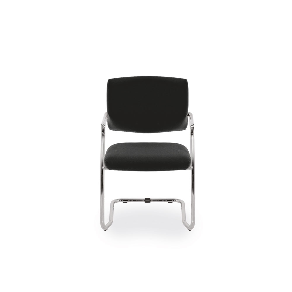 Sedia fissa GAIA a cantilever. Struttura in tubo di acciaio cromato con braccioli integrati. Sedile in polipropilene imbottito in poliuretano espanso ignifugo. Rivestimento in ecopelle nera.
