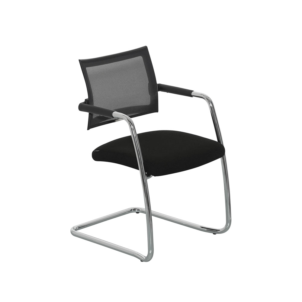 Sedia fissa IGEA con struttura a cantilever in tubo di acciaio cromato, schienale in poliammide rinforzato rivestito in rete ignifuga nera. Sedile imbottito e rivestito in tessuto ignifugo nero.