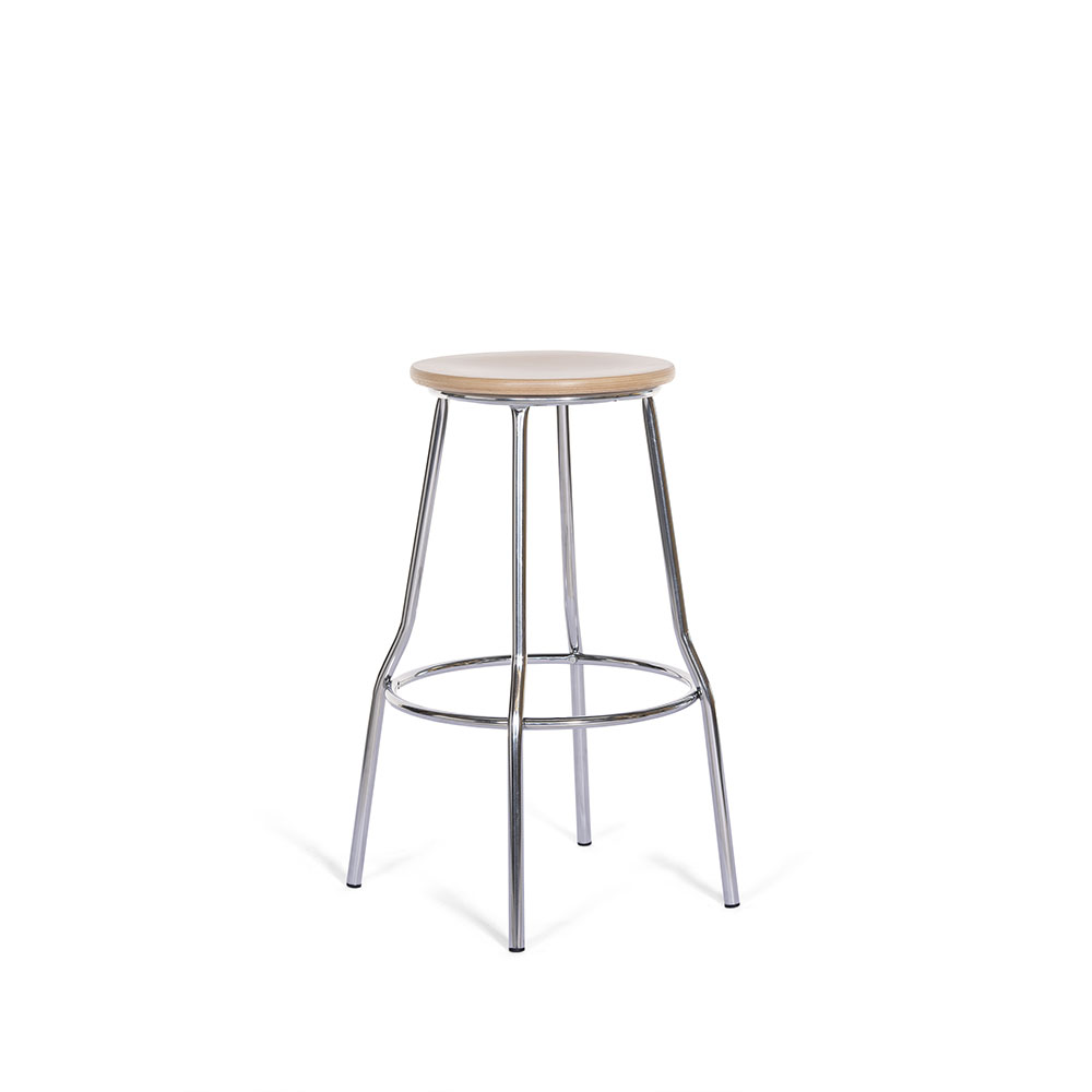 Sgabello fisso con poggiapiedi e sedile in faggio mm.720h. Struttura cromata.