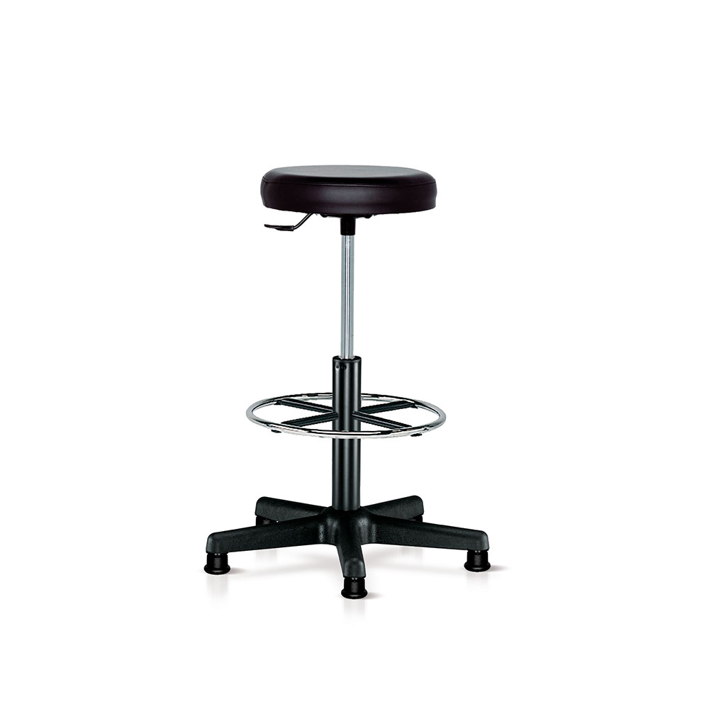 Sgabello girevole con pattini, sedile imbottito e rivestito in poliuretano nero, cerchio poggiapiedi, elevazione a gas da mm.570h a mm.830h. Smontato.