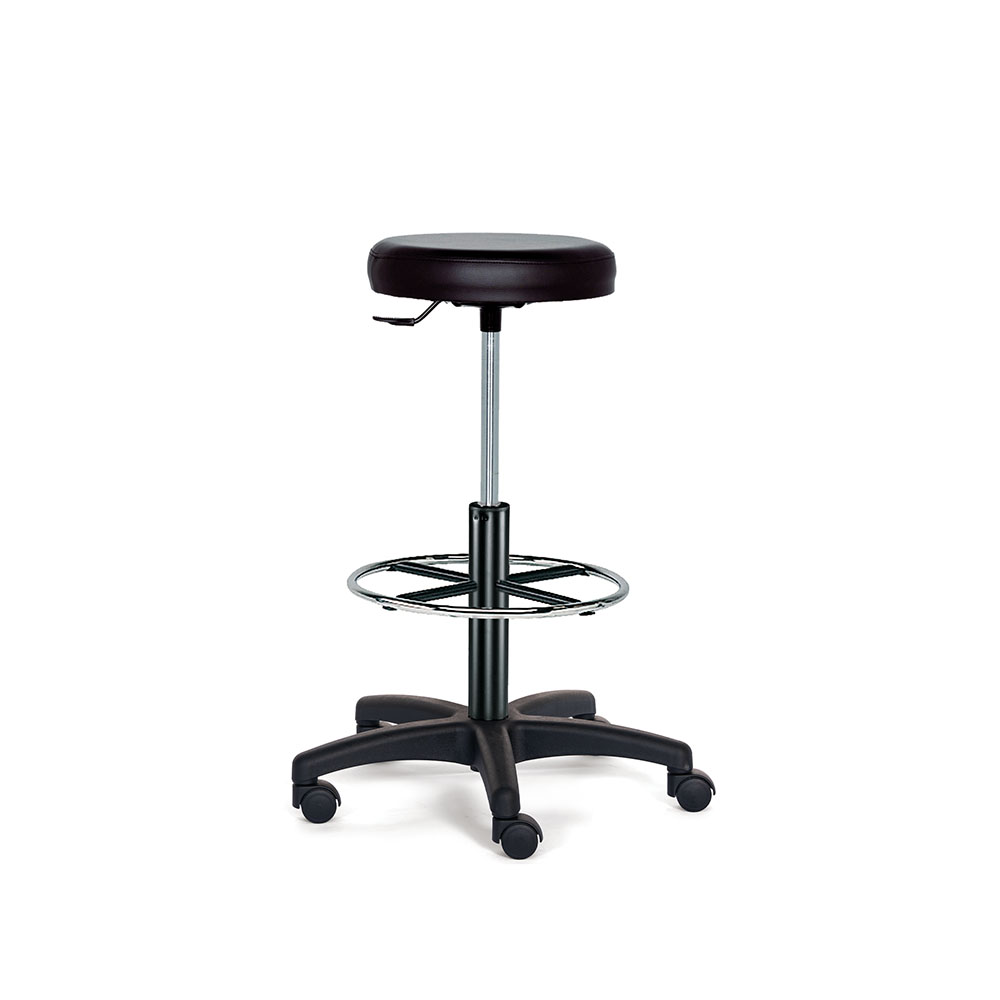 Sgabello girevole con ruote, sedile imbottito e rivestito in poliuretano nero, cerchio poggiapiedi, elevazione a gas da mm.590h a mm.850h. Smontato.