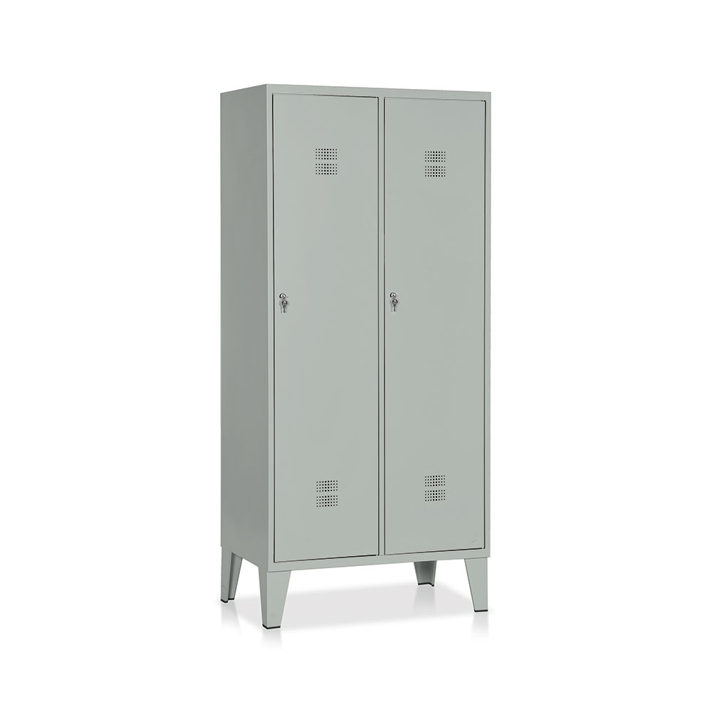 Armadio spogliatoio in lamiera sp. 6-7/10 a 2 posti con tramezza zincata, cappelliera, vano portascarpe, portagrucce e 2 ganci per asciugamani. Ante rinforzate e forate per l'aerazione, chiusura con serratura. Verniciatura a polvere grigio RAL 7038. Dim.: mm.810x500x1800h