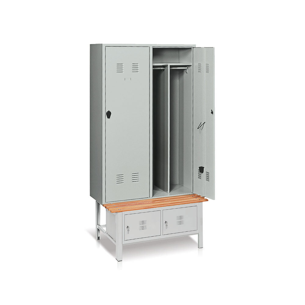 Armadio spogliatoio in lamiera sp. 6-7/10 a 2 posti con tramezza zincata, portagrucce, anello e vaschetta portaombrelli, cappelliera, 2 ganci per asciugamani. Ante rinforzate con feritoie d'aerazione, portacartellino e chiusura con nasello in plastica lucchettabile. Panca con seduta a 4 doghe in legno di noce bahia con 2 vani portascarpe di mm.335x300x240h con serratura e fori di aerazione. Smontato. Verniciatura a polvere grigio RAL 7038. Dim. totali: mm.1000x820x2065h.