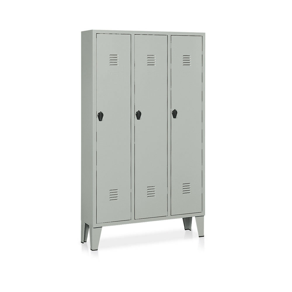 Armadio spogliatoio in lamiera sp. 6-7/10 a 3 posti con appendiabiti, anello e vaschetta portaombrelli, cappelliera e gancio per asciugamani. Ante rinforzate e forate per l'aerazione, portacartellino e chiusura con nasello in plastica lucchettabile. Verniciatura a polvere grigio RAL 7038. Dim.: mm.1020x330x1800h.