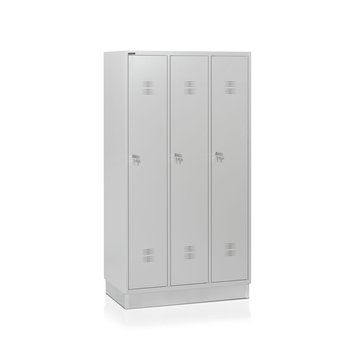 Armadio spogliatoio in lamiera sp. 6-7/10 a 3 posti con cappelliera, tubo portagrucce e 2 ganci per asciugamani. Ante rinforzate e forate per l'areazione, chiusura con serratura. Piedi in plastica ad altezza regolabile e zoccolo in estruso termoplastico rivestito in lamina di alluminio satinato e guarnizione alla base. Verniciatura a polvere grigio RAL 7038. Dim.: mm.905x500x1700h.