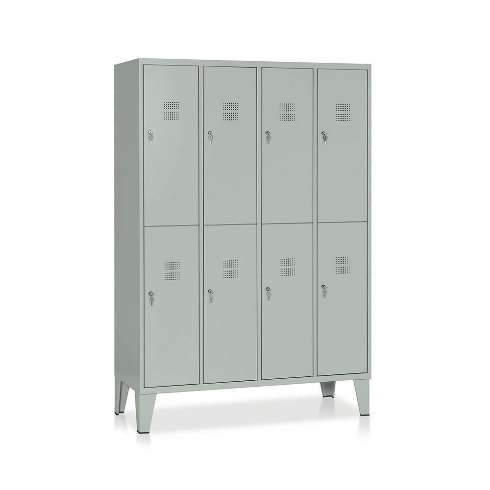 Armadio spogliatoio in lamiera sp. 6-7/10 a 8 vani con portagrucce e 2 ganci per asciugamani. Ante rinforzate e forate per l'aerazione, chiusura con serratura. Verniciatura a polvere grigio RAL 7038. Dim.: mm.1200x500x1800h.