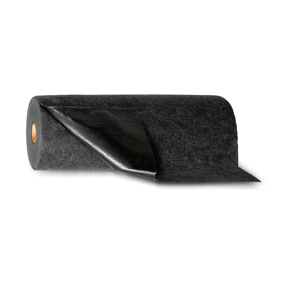Tappeto antiscivolo con un lato in polietilene; assorbente universalie in fibra di polipropilene di elevata qualità, per liquidi a base acquosa o a base olio, solventi, acetone, benzina, di m.30x0,90h, assorbenza lt. 90 per tappeto. Nero.