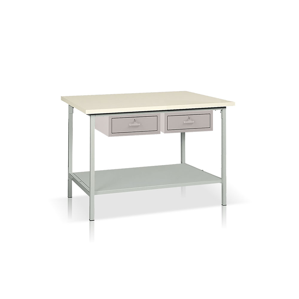 Tavolo con piano sp. mm.29 placcato su 1 lato in laminato plastico avorio, bordato in ABS. Struttura in tubolare di acciaio mm.30x30x1,5 con sottopiano e 2 cassetti scorrevoli su guide con cuscinetti a sfera e serratura. Portata kg.350. Smontato. Verniciatura a polvere grigio RAL 7038. Dim.: mm.1500x800x800h.