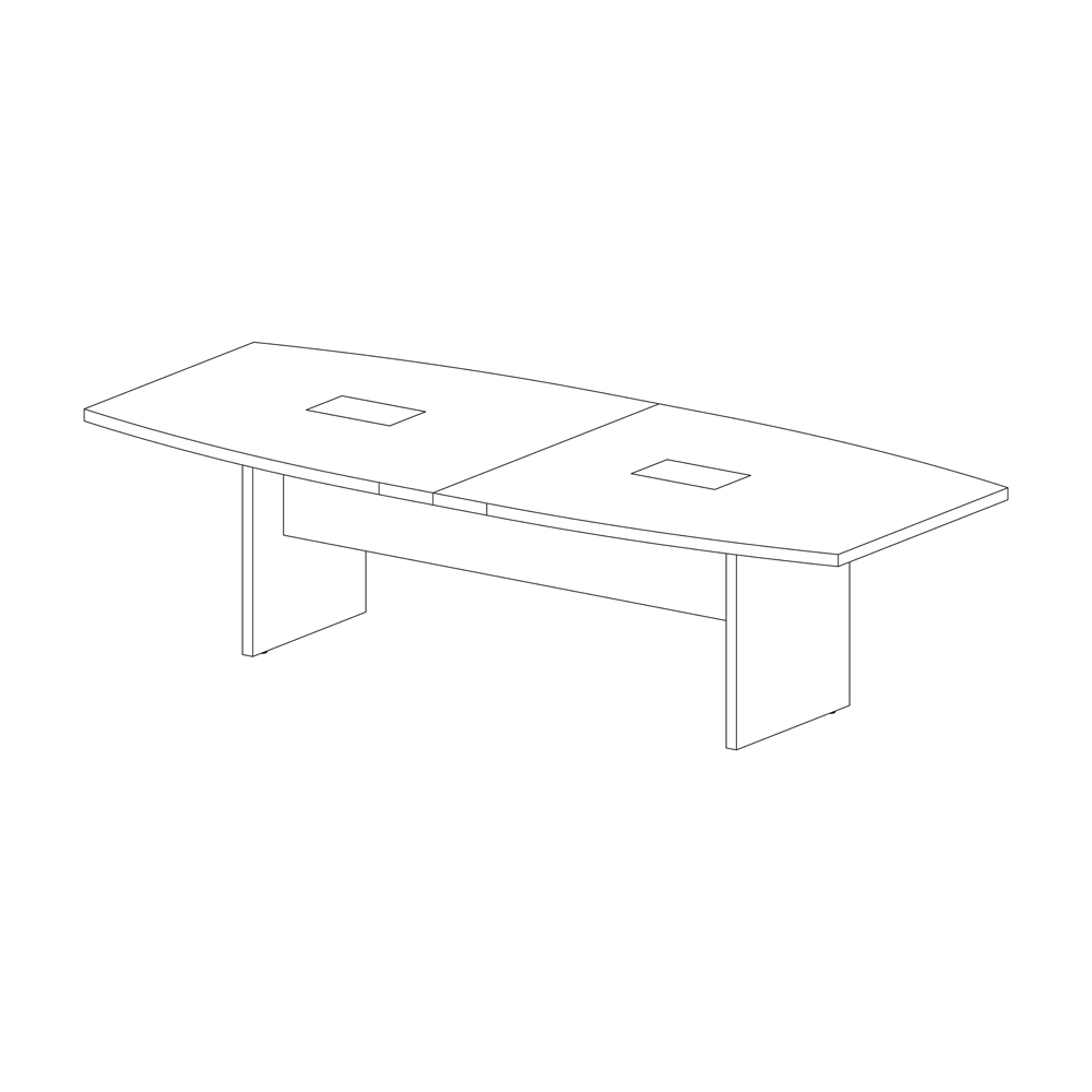 Tavolo riunioni sagomato con piani e fianchi in melaminico olmo scuro. Completo di top access e vasca raccoglicavi. Dim.: mm. 2800x1200x740h.