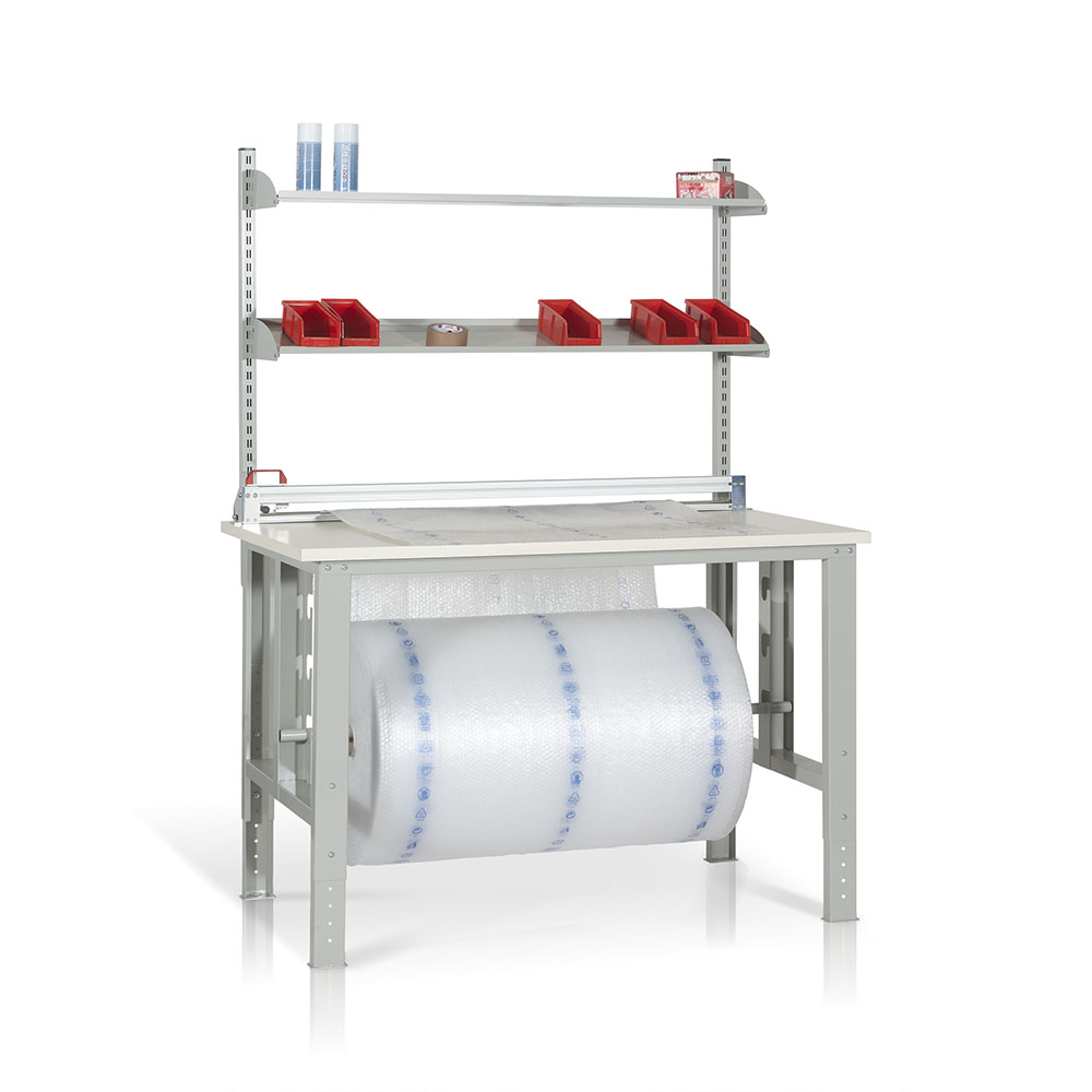 Tavolo da lavoro e da imballaggio ergonomico con piano sp. mm.29 placcato in laminato plastico avorio, bordato in ABS, elevabile in altezza e predisposto per il fissaggio. Tubo portabobine, diam.mm.30, agganciabile a 3 altezze, 2 mensole e taglierina di mm.1490 (taglio utile mm.1240) con dispositivo anticaduta. Verniciatura a polvere grigio RAL 7038. Dim.: mm.1500x840x780/1150+990h (montanti).
