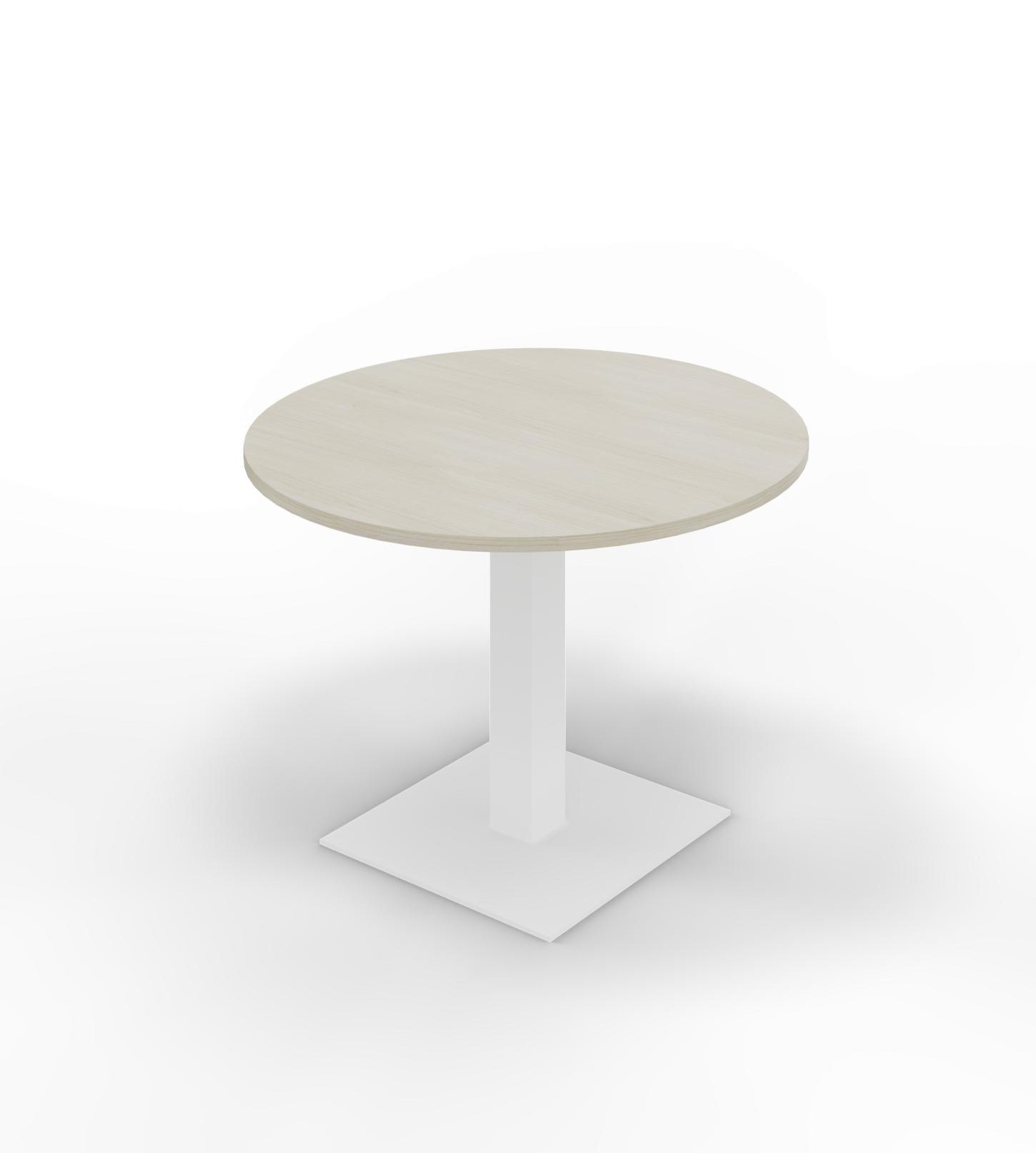 Tavolo riunione tondo. Piano in melaminico acero, basamento in acciaio verniciato colore bianco. Dim.: diametro mm. 1050x745h.