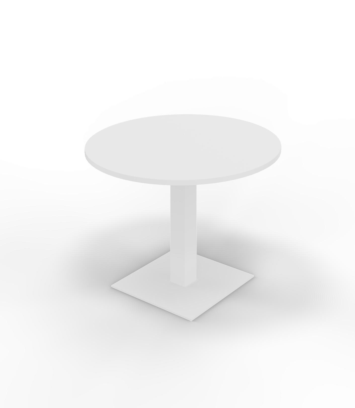 Tavolo riunione tondo. Piano in melaminico bianco, basamento in acciaio verniciato colore bianco. Dim.: diametro mm. 1050x745h.