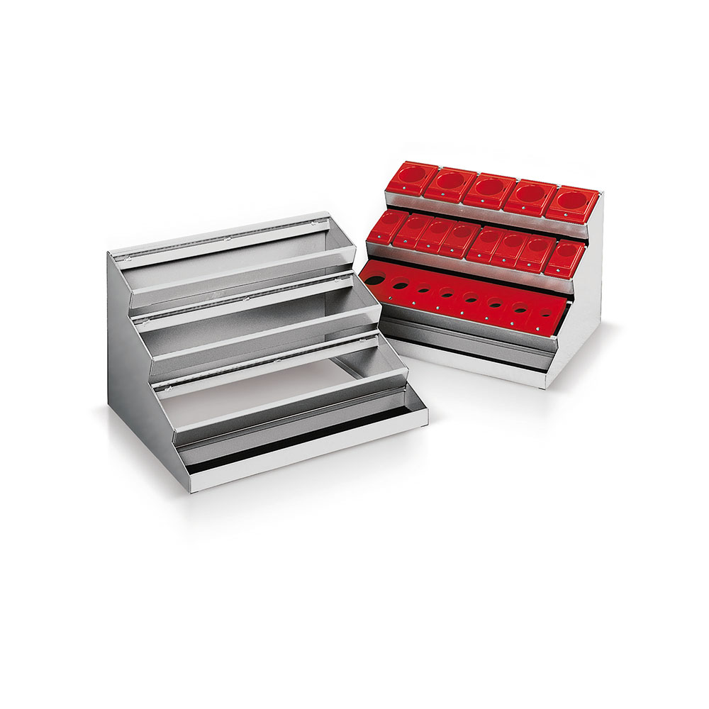 Telaio portaboccole da banco a 3 file in lamiera. Verniciatura a polvere grigio chiaro RAL 7035. Dim.: mm.565x450x351h
