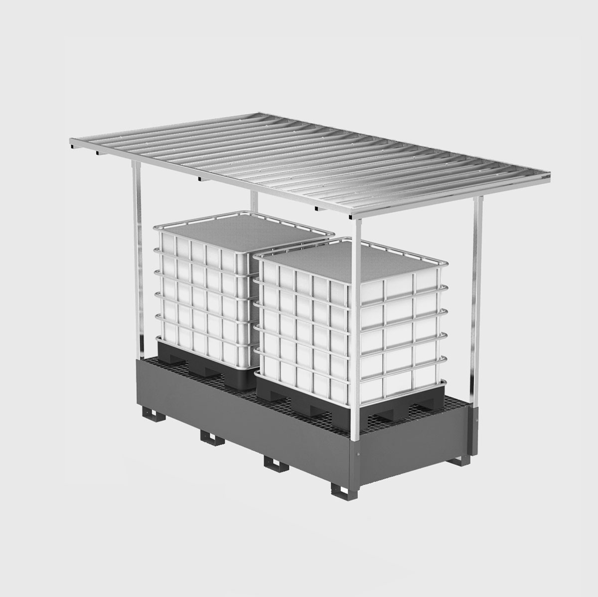 Vasca a tenuta stagna in lamiera con piano di appoggio in grigliato zincato, per 8 fusti da lt.200 o 2 cisternette, tettoia zincata. Portata kg.2000. Capacità lt.1400. Grigio scuro RAL 7000. Dim.: mm.2400x1300x292+piede 100h.