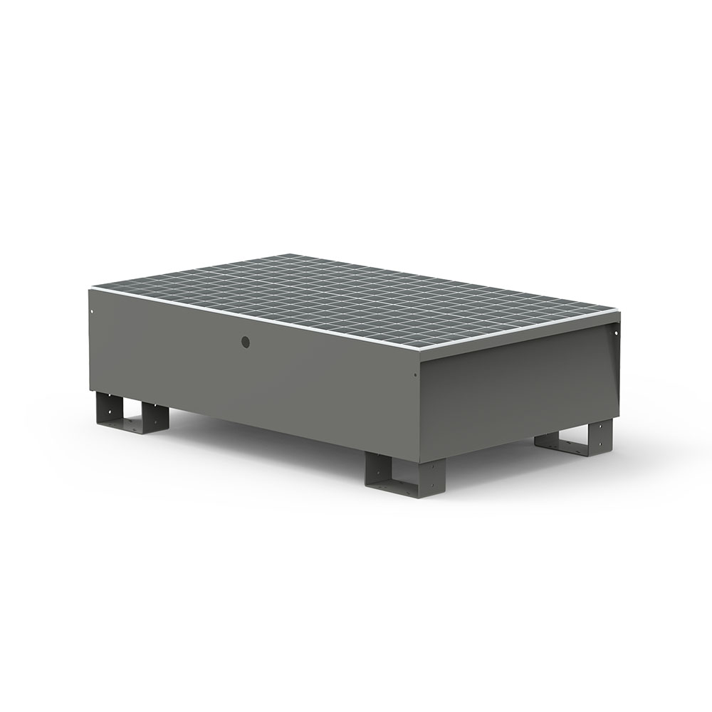 Vasca a tenuta stagna in lamiera con piano di appoggio asportabile in grigliato zincato a caldo, per 2 fusti da lt.200. Portata kg.500. Capacità lt.200. Verniciatura a polvere per esterno grigio scuro RAL 7000. Dim.: mm.1300x800x292h + piede 100h.