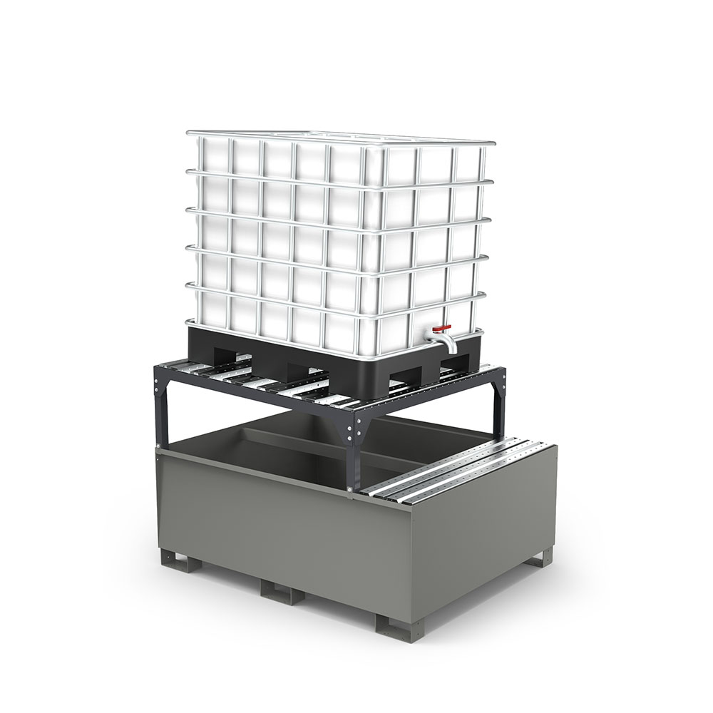 Vasca a tenuta stagna in lamiera con piano di appoggio asportabile a doghe zincato, per 1 cisternetta da lt.1000. Supporto inclinato per le operazioni di travaso. Portata kg.1300. Capacità lt.1000. Verniciatura a polvere per esterno grigio scuro RAL 7000 per la vasca e antracite RAL 7016 per il supporto. Dim.: mm.1600x1300x950h + piede 100h.
