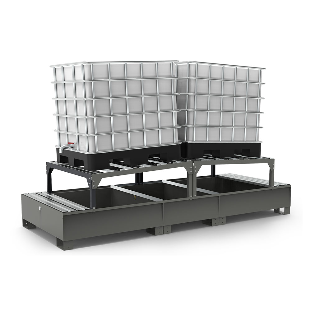 Vasca a tenuta stagna in lamiera con piano di appoggio asportabile a doghe zincato, per 2 cisternette da lt.1000. Supporto inclinato per le operazioni di travaso. Portata kg.2500. Capacità lt.1100. Verniciatura a polvere per esterno grigio scuro RAL 7000. Dim.: mm.3200x1300x707h + piede 100h.