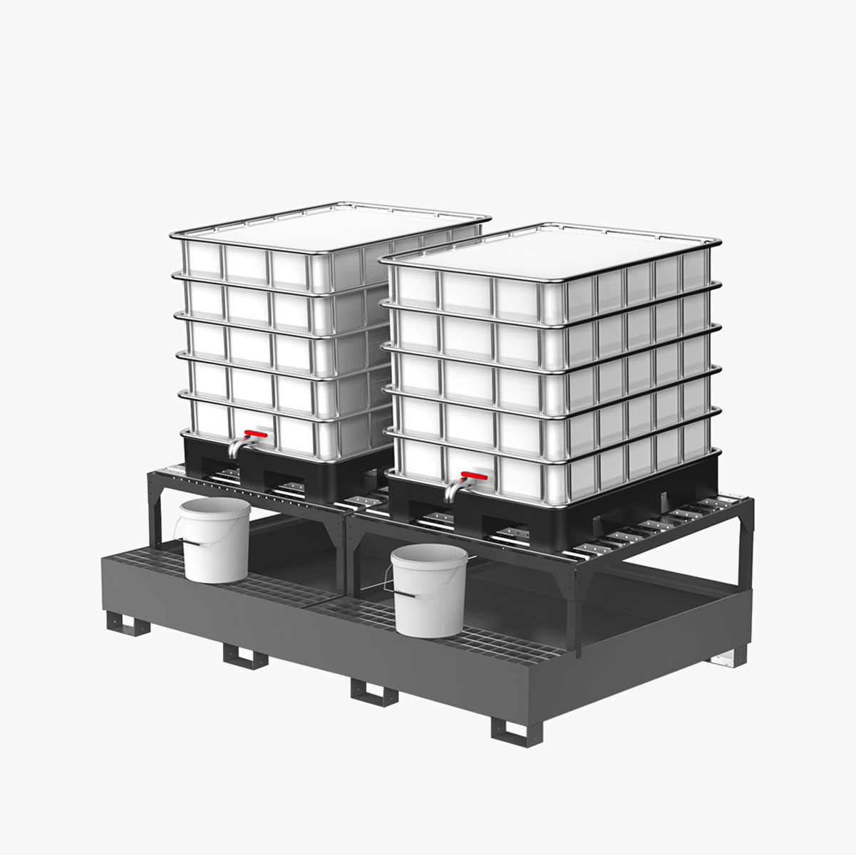 Vasca a tenuta stagna in lamiera con piano di appoggio asportabile in grigliato zincato, per 2 cisternette da lt.1000. Supporto inclinato per le operazioni di travaso con doghe. Capacità lt.1050. Verniciatura a polvere per esterno grigio scuro RAL 7000. Dim.: mm.2610x1600x700h + piede 100h.